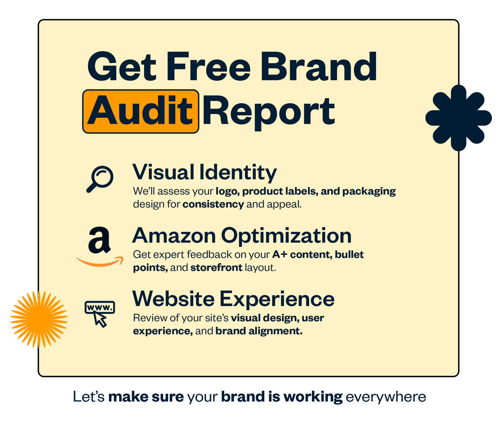 We believe great branding isn’t just how it looks, it’s how it feels. That’s why we’re offering you a FREE Brand Audit to help you understand how your brand is doing and how to take it to the next level.